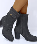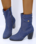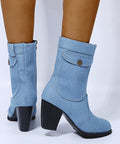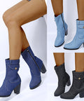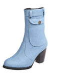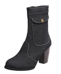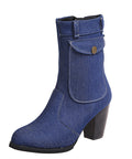 Denim Mid-calf Boots – a chic blend of fashion and comfort, crafted with a denim cloth upper and designed with a stylish wedge silhouette. Featuring a round toe and thick high heel, these boots deliver both height and stability, making them the perfect choice for everyday wear or statement outfits.